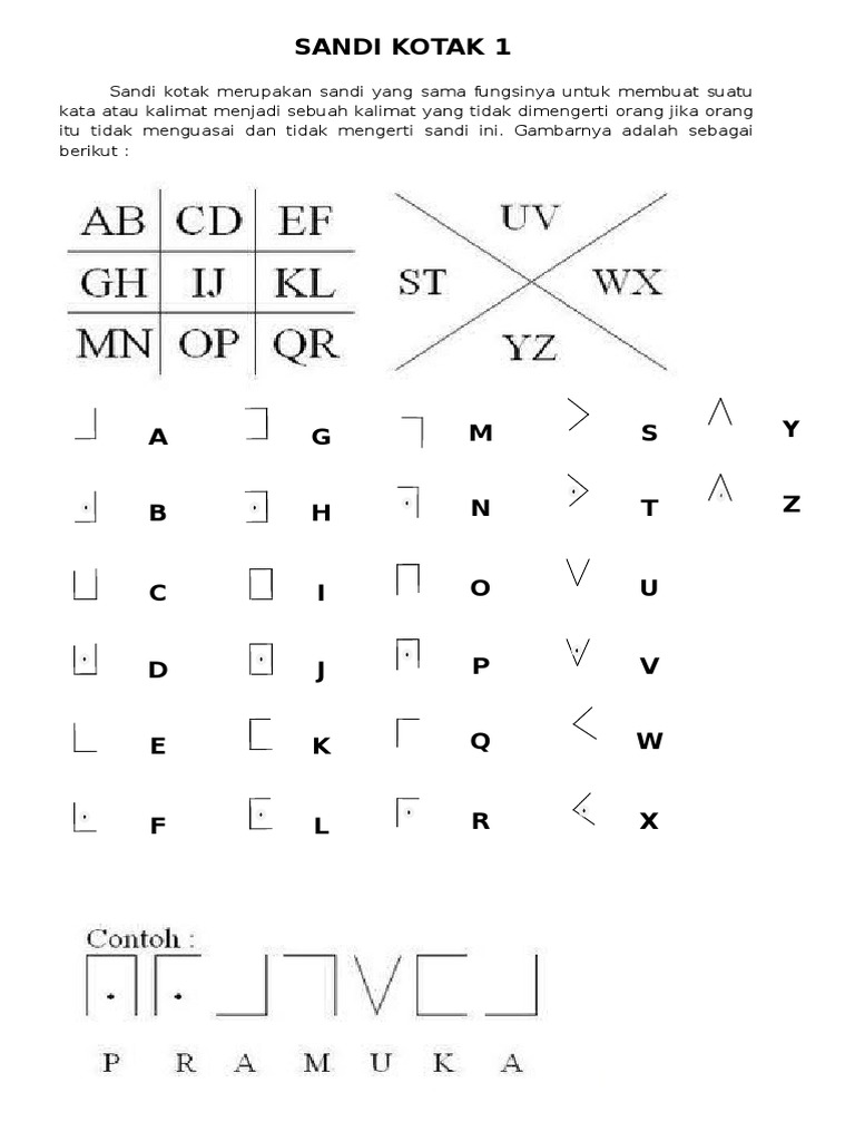 Contoh soal sandi kotak 2. Hal ini juga berlaku di dunia kepramukaan. Contoh soal sandi morse pramuka ruang belajar siswa kelas 8. Sandi morse pramuka sejarah contoh soal dan tabel morse penulis. Siapakah nama bapak pandu sedunia? Sandi dalam kegiatan kepramukaan ensiklopedia pramuka. Pada artike ini penulis cilik akan memberikan info tentang sandi morse pramuka. B e r l a r i p n a t h a l. 'a=n' adalah kata kunci dalam untuk membuat atau memecahkan sandi, ganti setiap huruf dalam sebuah kata dengan huruf yang kumpulan soal pramuka penggalang dan penegak 1. Latihan soal berikut ini mencakup berbagai macam sandi diantaranya adalah sandi an az jam koordinat angka kimia semaphore morse sandi rumput sandi paku sandi kotak 1. Pastinya pada semangat semua dong ya. Kumpulan sandi pramuka lengkap dari a z. Sandi kotak pengertian contoh jenis gambar lengkap.